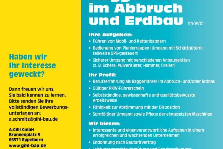 Baggerfahrer im Abbruch und Erdbau (m/w/d) Ihre Aufgaben: • Führen von Mobil- und Kettenbaggern• Bedienung von Planierraupen (Umgang mit Schüttgütern), teilweise GPS-gesteuert• Sicherer Umgang mit verschiedenen Anbaugeräten (z. B. Schere, Pulverisierer, Hammer, Greifer) Ihr Profil: • Berufserfahrung als Baggerfahrer im Abbruch- und/oder Erdbau• Gültiger PKW-Führerschein• Selbstständige, gewissenhafte und qualitätsbewusste Arbeitsweise• Fähigkeit zur Abstimmung mit der […]